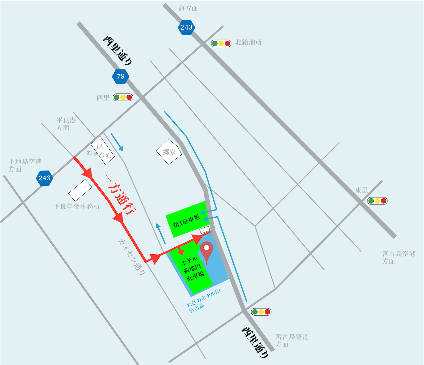 当ホテルは敷地内駐車場と第一駐車場の2か所の駐車場をご用意がございます。ホテル前面の西里通りとホテル北側道路は両方向通行となります。ご宿泊者様は空いている駐車スペースへお停めくださいませ。