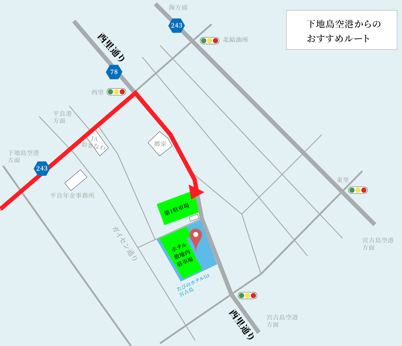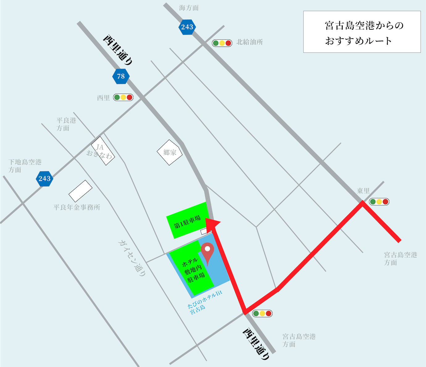 当ホテルは宮古島市の中心部に位置し、観光・ビジネスなどの様々なニーズを適える、好アクセスの立地が特徴です。宮古島のメインストリートである西里通りに面し、観光地へのアクセスの良さに加え、ランチからディナーまで宮古島グルメをたっぷりと堪能できる飲食店などをホテルから徒歩でお楽しみいただけます。