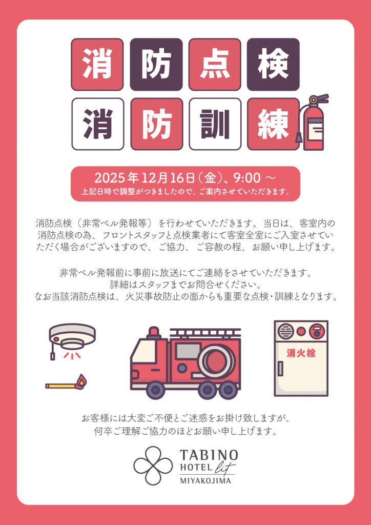 消防点検(非常ベル発報等)を行わせていただきます。当日は、客室内の消防点検の為、フロントスタッフと点検業者にて客室全室にご入室させていただく場合がございますので、ご協力、ご容赦の程、お願い申し上げます。非常ベル発報前に事前に放送にてご連絡をさせていただきます。