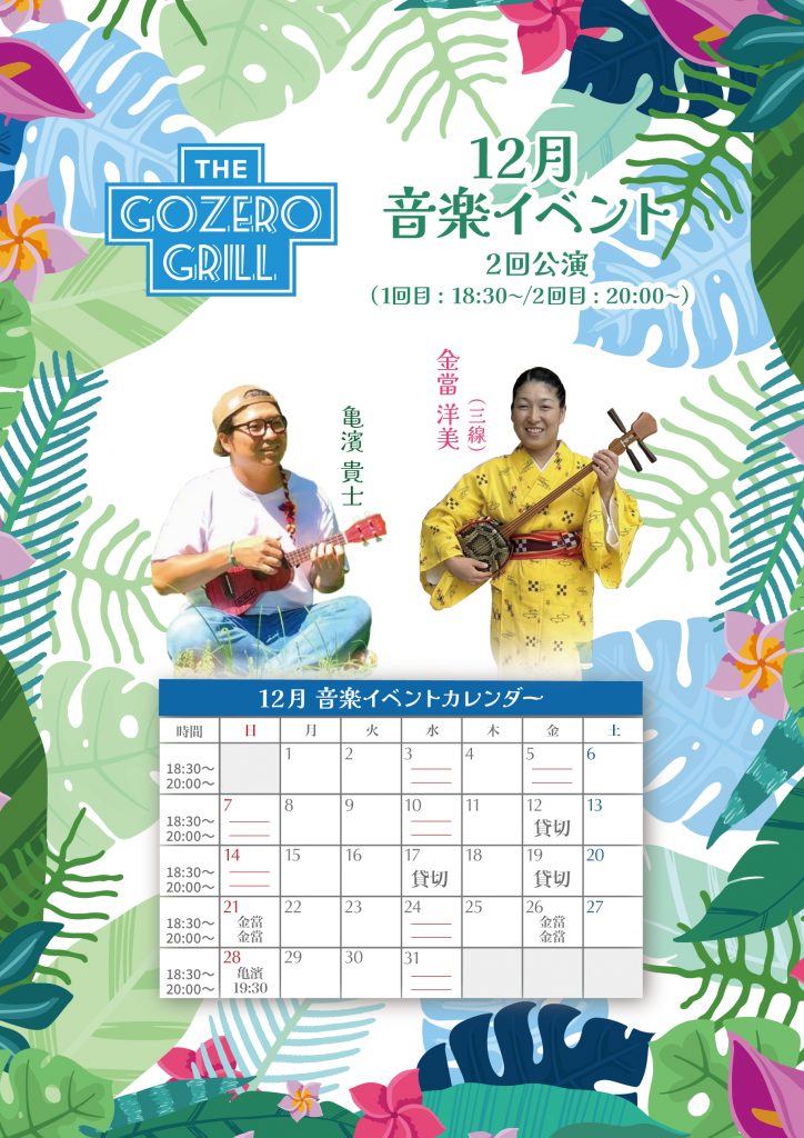 12月「The Gozero Grill」音楽イベント毎週:水、金、土、日曜日(2公演) 1回目18:30~ 2回目20:00~