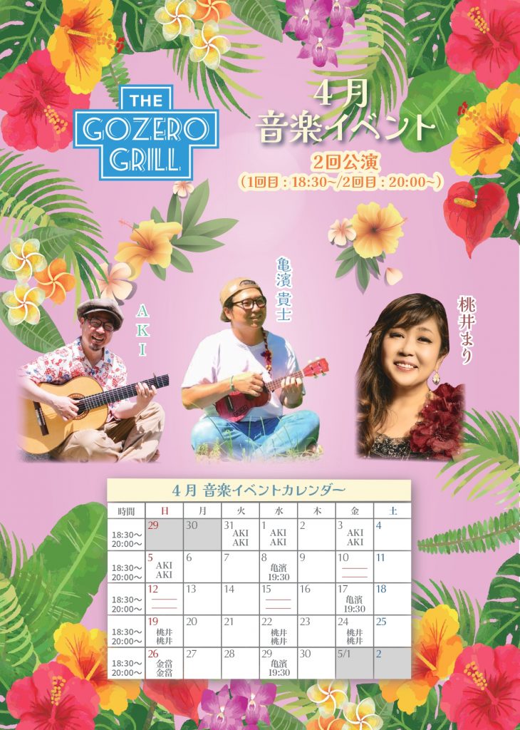 4月「The Gozero Grill」音楽イベント毎週:水、金、土、日曜日(2公演) 1回目18:30~ 2回目20:00~